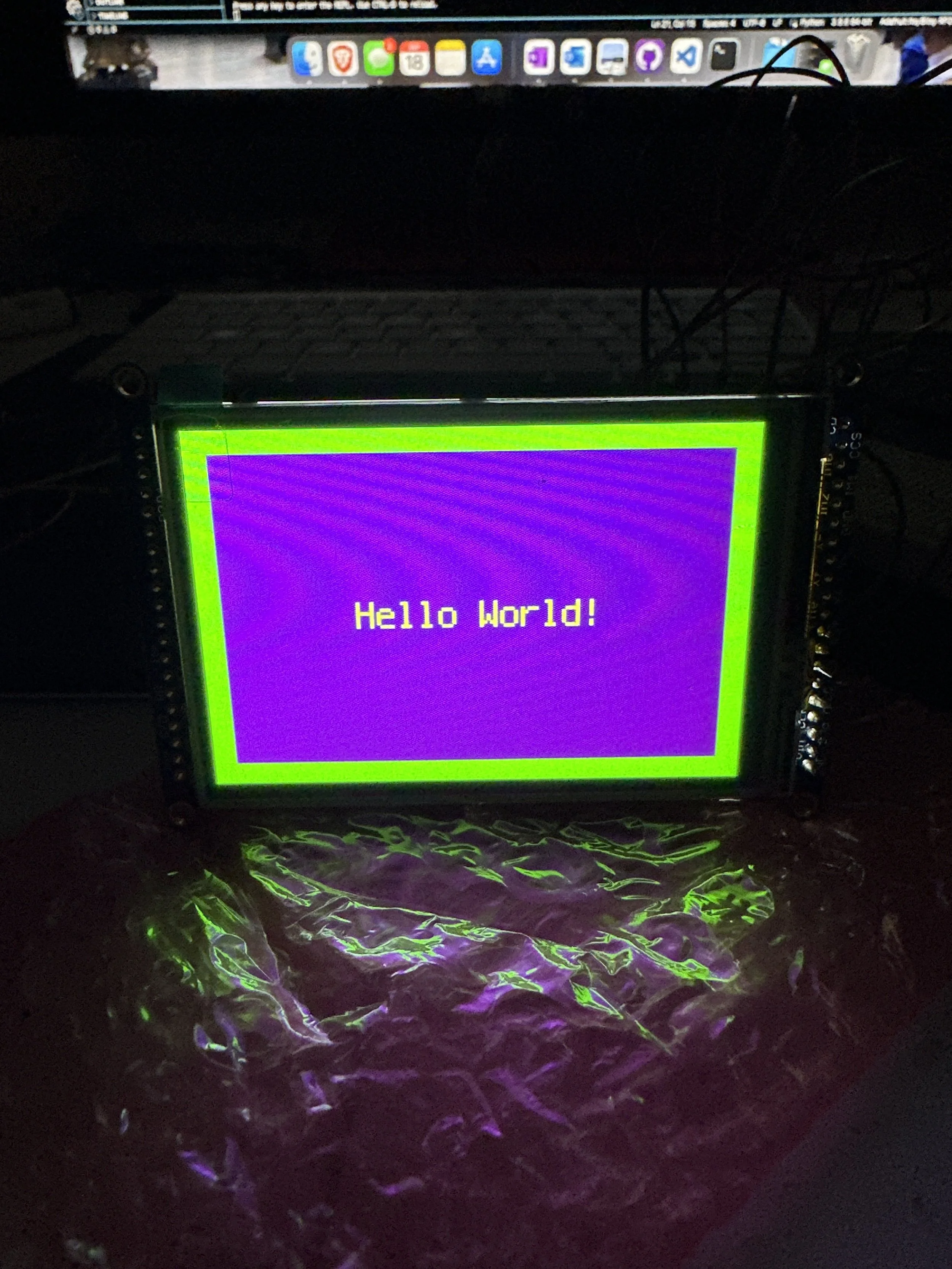 It’s important to test components and make sure everything works as expected. To keep development simple, the displayio library was used. It is not quite as performant as stage and does not (as of this writing in 2024) provide any built-in functions for rotating bitmaps. The display used in this example is connected via SPI, but this could be improved to used an 8-Wire. Later examples will show the slowness of the display, on account of using SPI among other factors. The Hello World example can be found here.