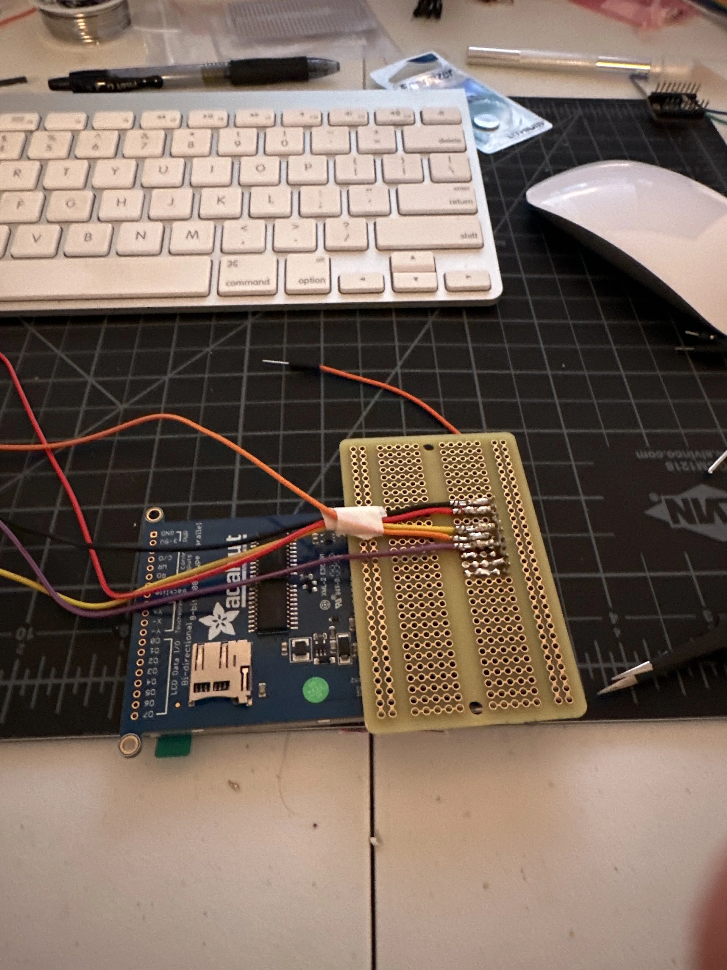 The SPI interface in this case requires 8 connections: 5V, GND, MISO, MOSI, CLK, C/S, DC, Backlight. The screen was connected to a PCB Proto board with headers, and wires were soldered on from there. This image is the completed screen sub-assembly.